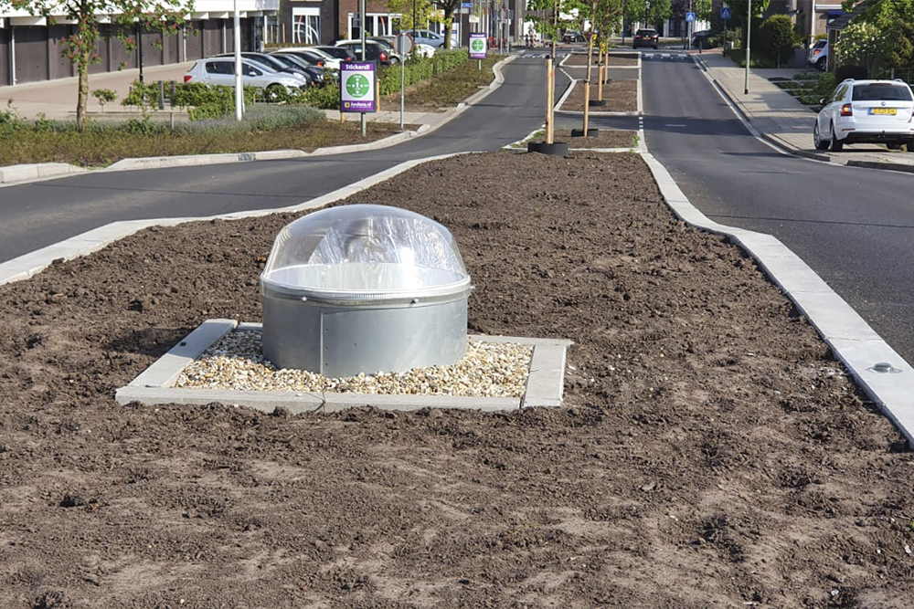 1x Solatube 53 cm est monté sur le terre-plein entre les deux voies de la route. Le Solatube fournit la lumière du jour au milieu du tunnel cyclable. La municipalité voulait créer un effet d'arc-en-ciel à l'intérieur du tunnel. Pour ce faire, on a utilisé un diffuseur spécial. De plus, une finition sur mesure permet de protéger le système contre le vandalisme.