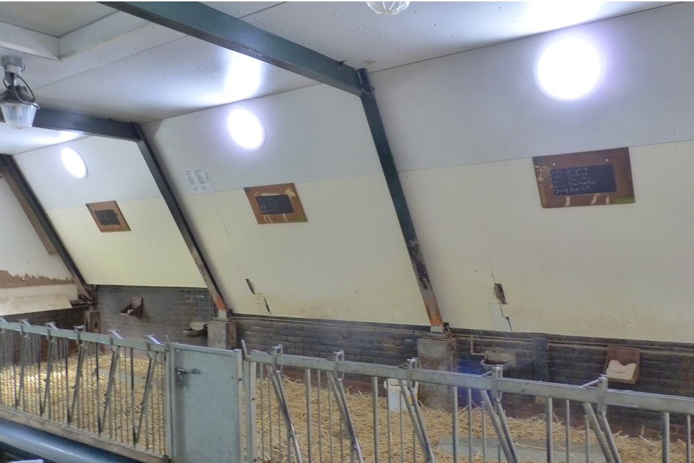 In de afdelingen met de Solatubes is het prettiger voor de dieren en de mensen die er werken. Alleen in de winter worden de zeugen ’s ochtends nog met de TL-verlichting aan gecontroleerd. De rest van de dag zijn bij ons de TL’s uit en is er voldoende licht door de Solatubes. In de lente hebben we de ramenstrook aan de zuidzijde van de stal wit laten kalken om het felle directe zonlicht niet op de varkens te krijgen. De Solatubes geven prettig diffuus licht.