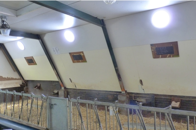 De minimumeis van 2% daglichtoppervlakte die wordt gesteld door Maatlat Duurzame Veehouderij was al behaald door een ramenstrook. Voor de werknemers en voor de dieren is het prettiger om meer en natuurlijker licht in de afdelingen te hebben. Lichtdoorlatende platen waren geen optie, aangezien deze op den duur groen uitslaan en daardoor minder licht door laten.